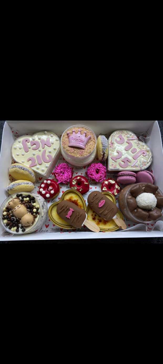 מארז מושחת בגווני הורוד המורכב ממוסים בטעמים בבחירה אישית,קרם ברולה,דונטסים,אלפחורס ומגנומים